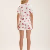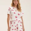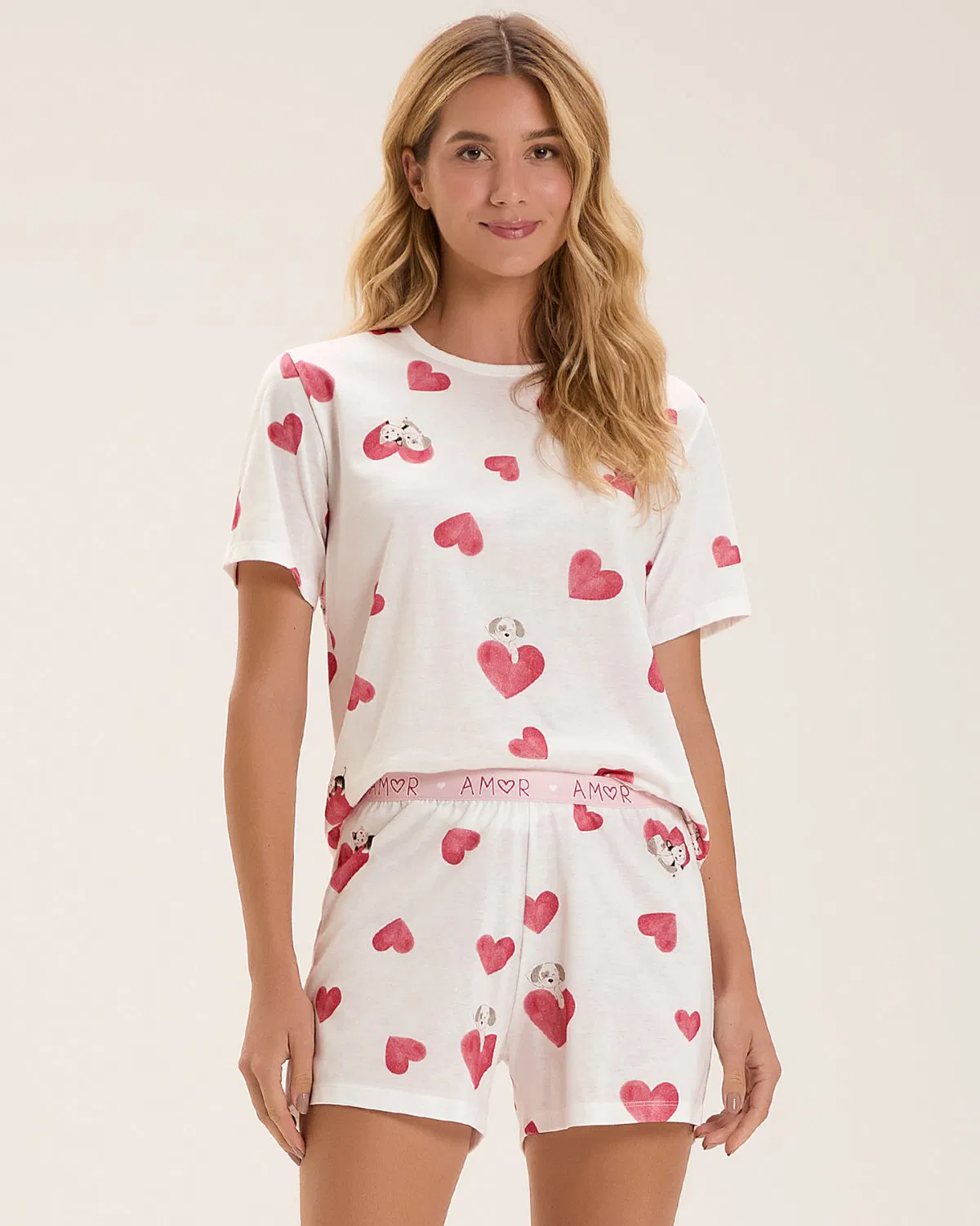 Delicado, divertido e cheio de personalidade, este pijama feminino de manga curta com shorts é feito em malha comfort leve e macia, ideal para noites agradáveis e cheias de estilo. Com fundo off white, a peça recebe uma estampa encantadora de corações acompanhada das graciosas interferências dos novos mascotes da marca: uma gatinha frajola cheia de charme e um cachorrinho branco com detalhes cinza, ambos transbordando fofura